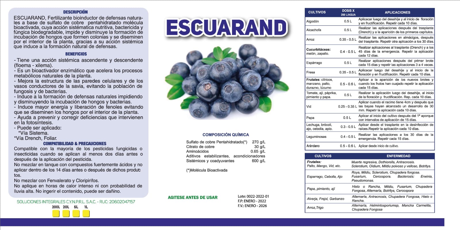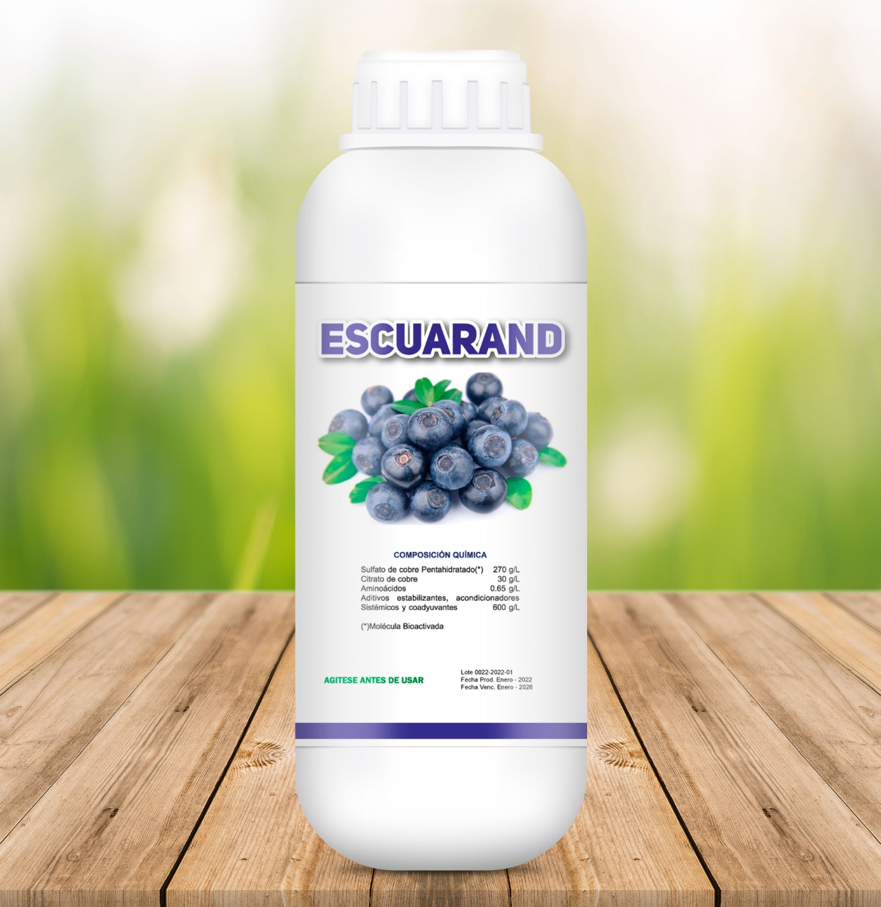 ESCUARAND, Fertilizante bioinductor de defensas naturales a base de sulfato de cobre pentahidratado molécula bioactivada, cuya acción sistémica nutritiva, bactericida y fúngica biodegradable, impide y disminuye la formación de incubación de hongos que formen colonias y se diseminen por el interior de la planta, gracias a su acción sistémica que induce a la formación natural de defensas.